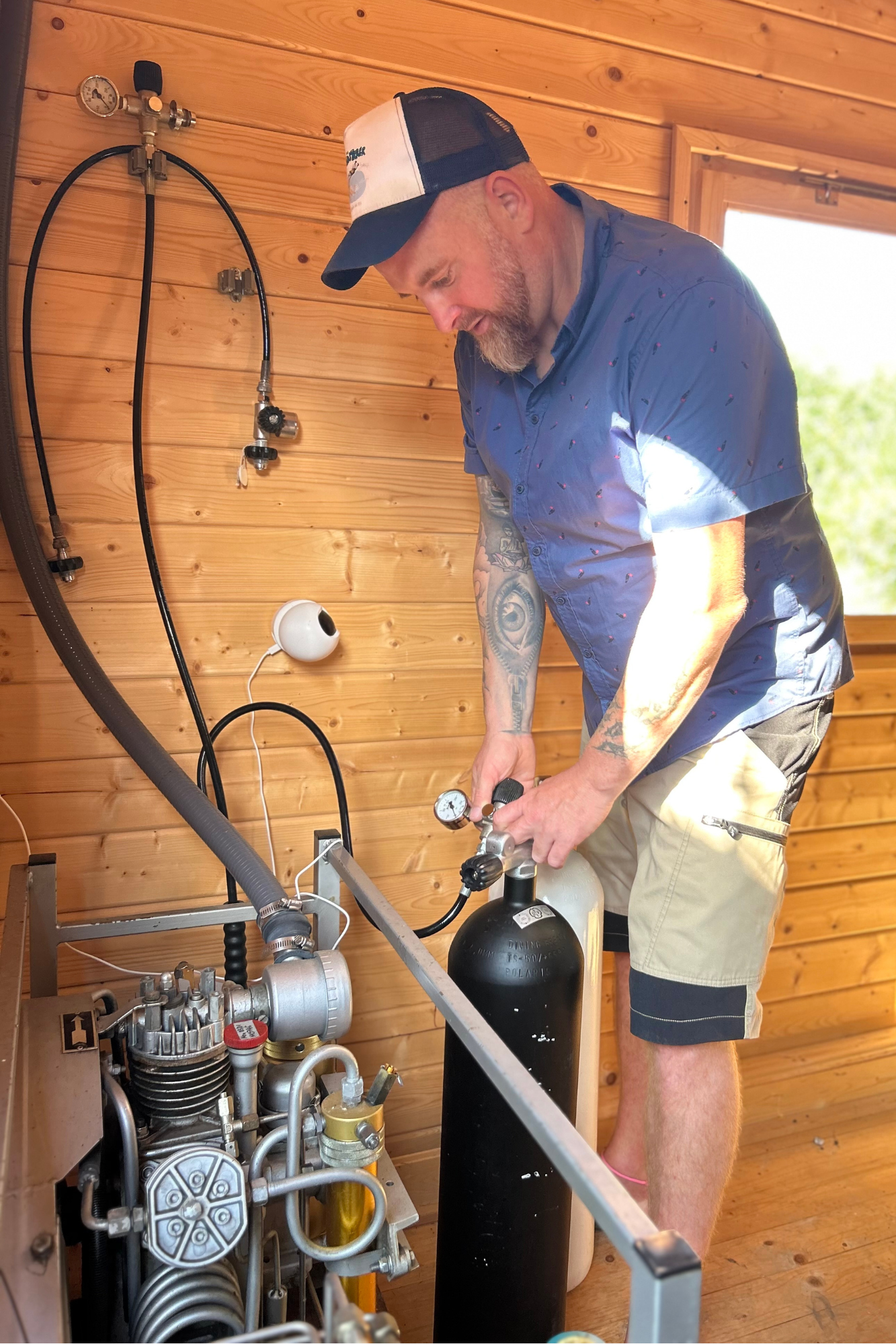Ob 200 bar oder 300 bar – wir pumpen deine Flasche voll, bis sie zufrieden seufzt. Pressluft, Nitrox